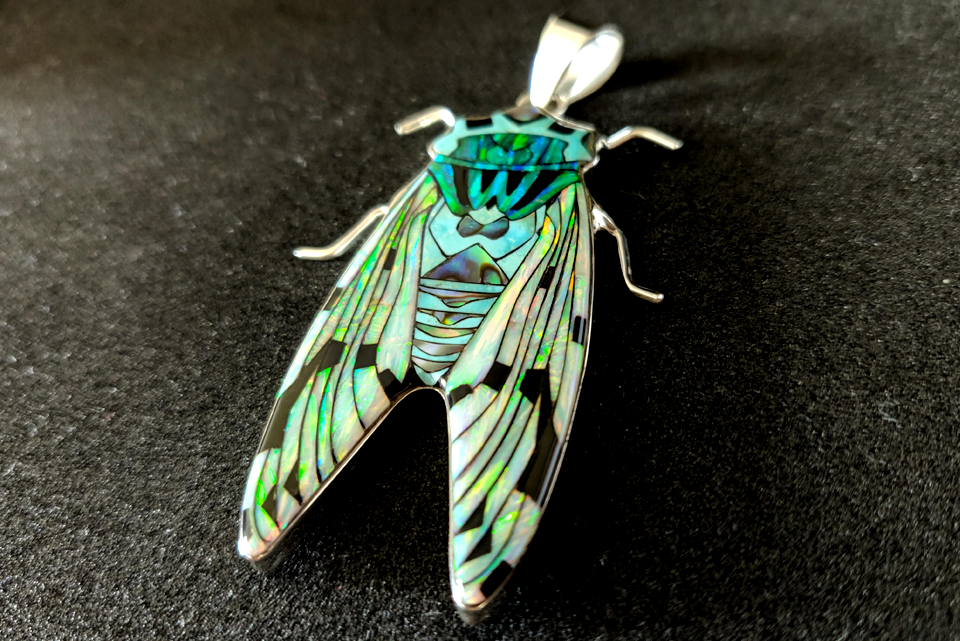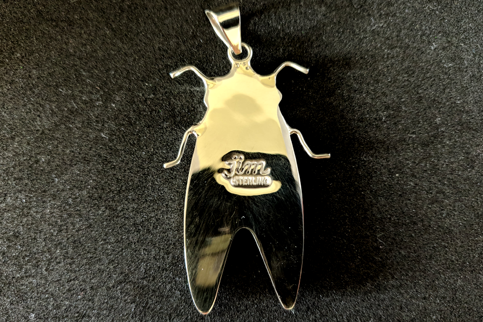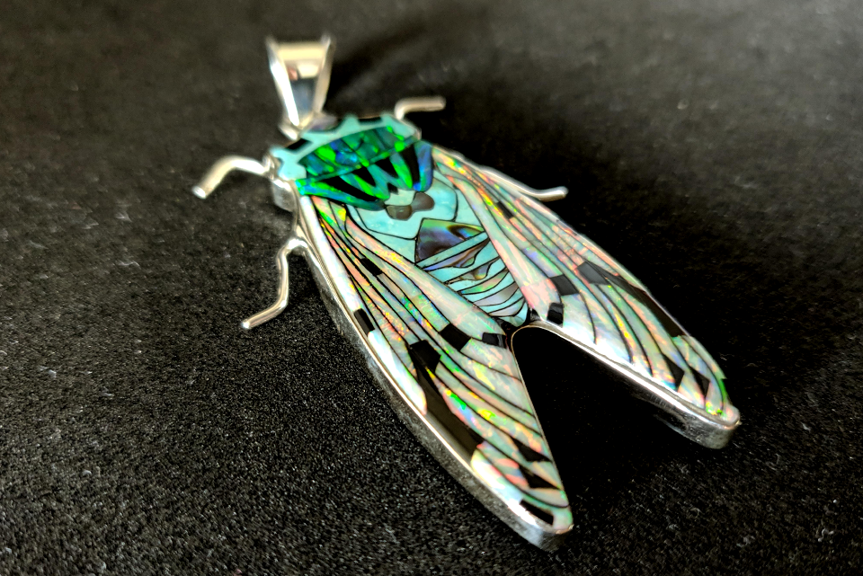 Add a touch of whimsy to your jewelry collection with our Cicada Inlay Pendant. This unique and eye-catching piece features intricate inlays of shimmering lab opal, iridescent mother of pearl, and vibrant turquoise, all set in a casing of sterling silver. The cicada design is inspired by the magical and mysterious insects that appear every summer, and is sure to catch attention. Please note that the necklace is not included and the price is for the pendant only. The pendant has a weight of 11 grams and measures 1.1 inches by 2.0 inches (excluding the bail). It's the perfect size to make a statement without weighing you down. Wear it on its own for a subtle hint of magic, or pair it with other turquoise pieces for a bold and stylish look. Perfect for any nature lover or insect enthusiast, this pendant is sure to become a treasured addition to your jewelry collection. Shop now and embrace the wonders of the natural world.