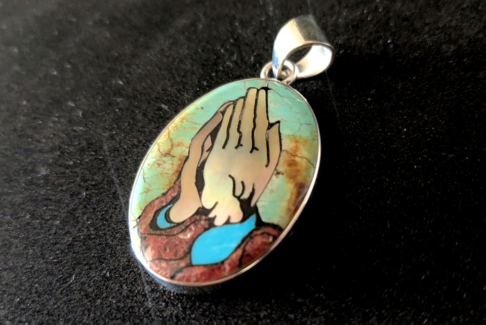 Introducing our exquisite Sterling Silver Praying Hand Inlay Pendant, meticulously crafted with an enchanting blend of turquoise, mother of pearl, and coral. This upgraded version offers an alluring and refined design that is sure to captivate any jewelry enthusiast.